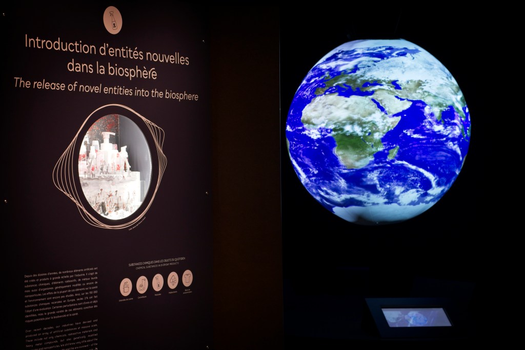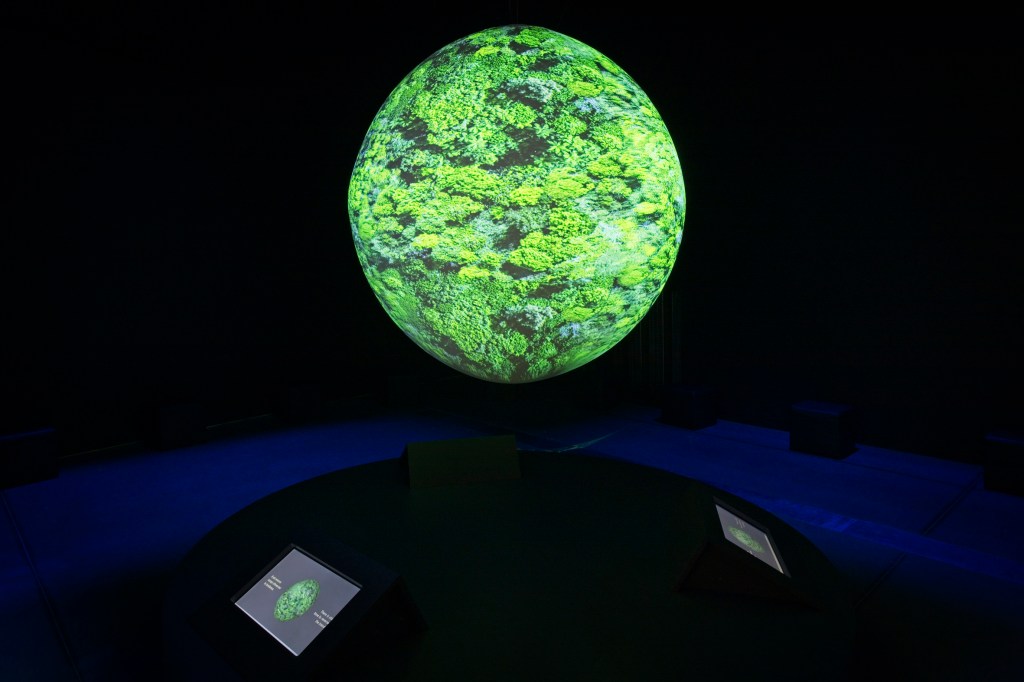 Film en projection sur une sphère, présentant la manière dont l’homme, pour dominer la nature, a ravagé la planète en quelques décennies à peine.