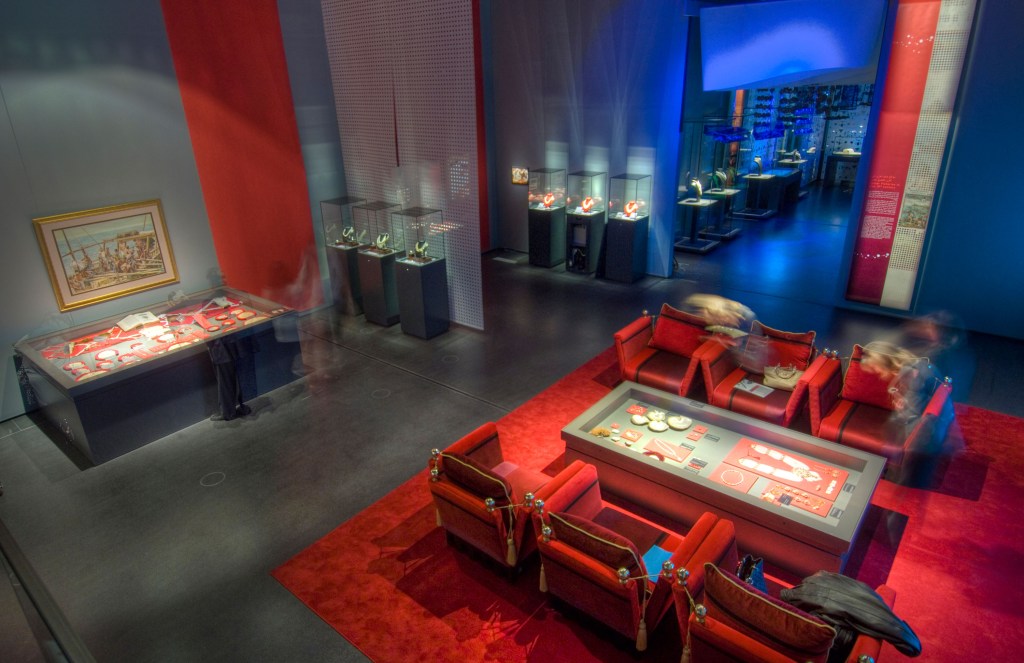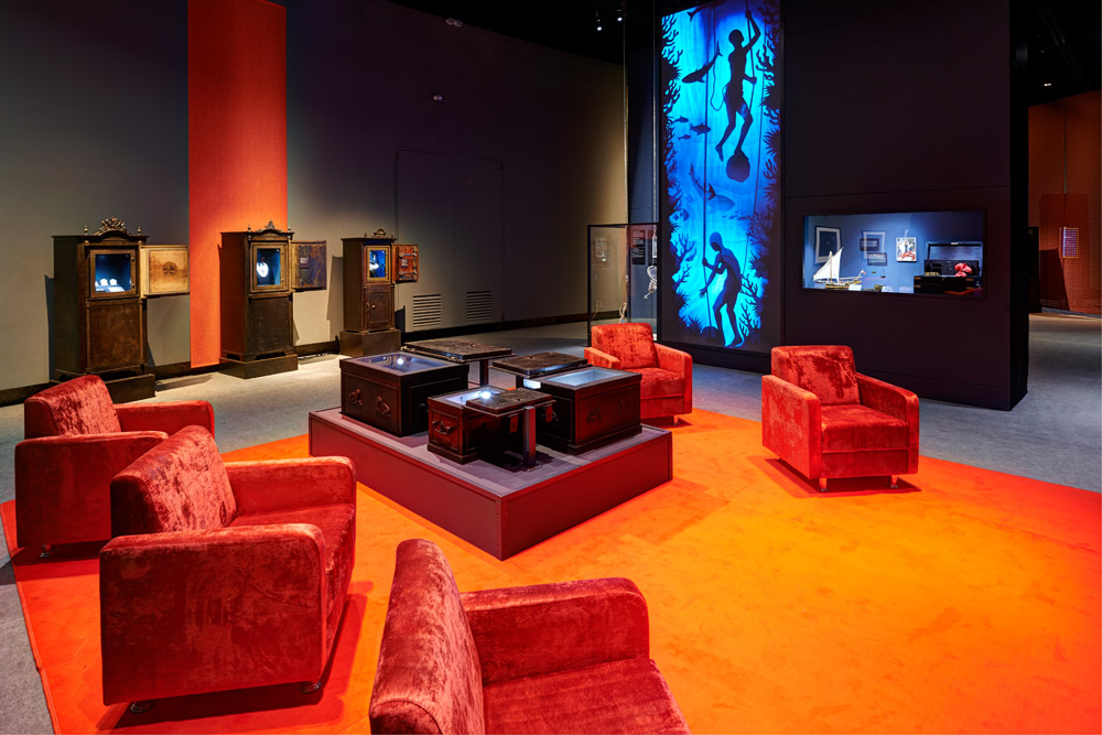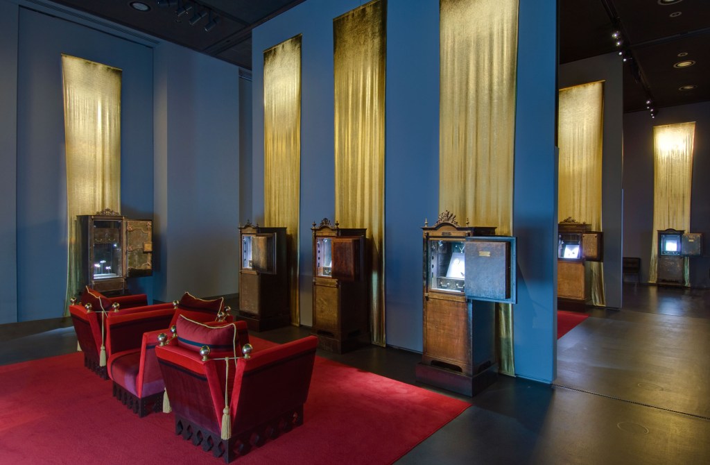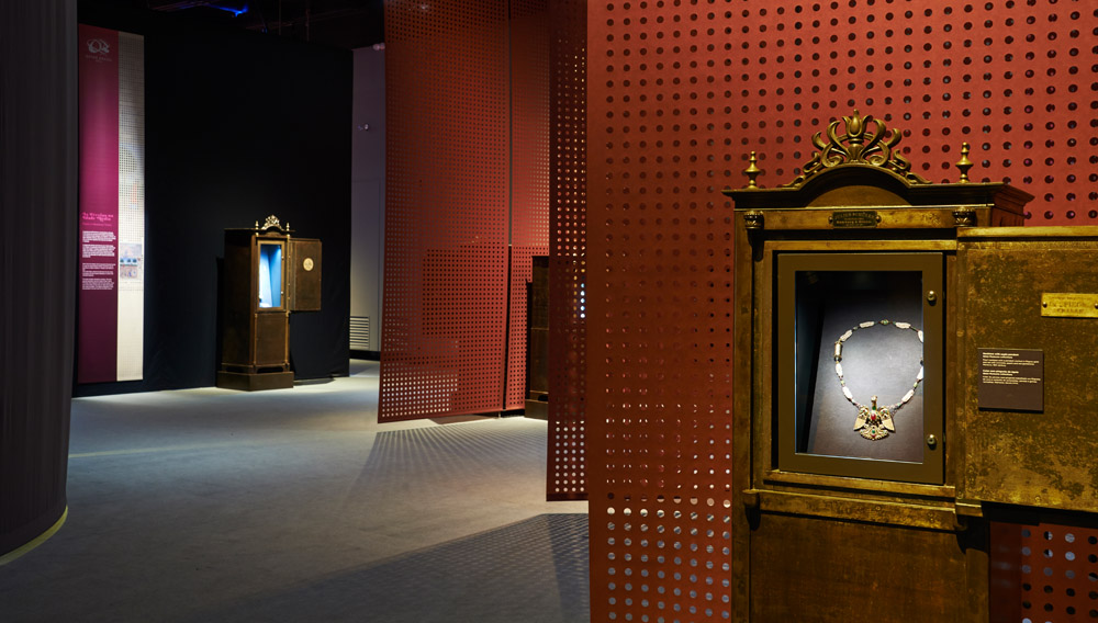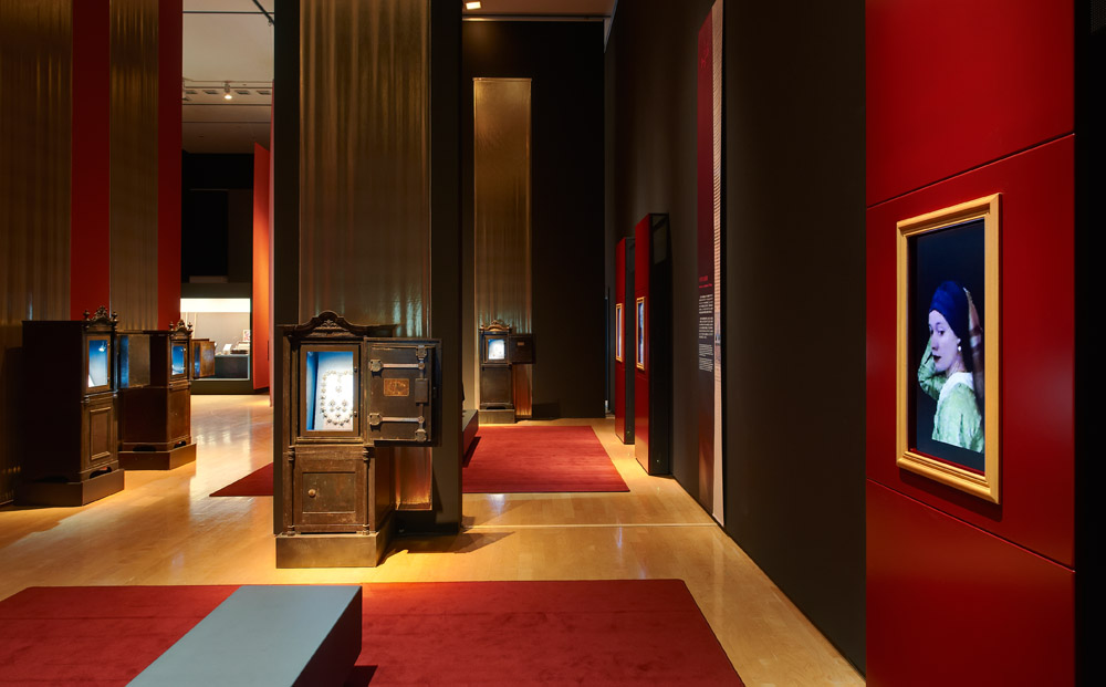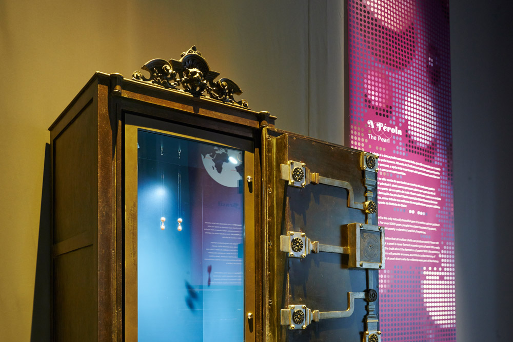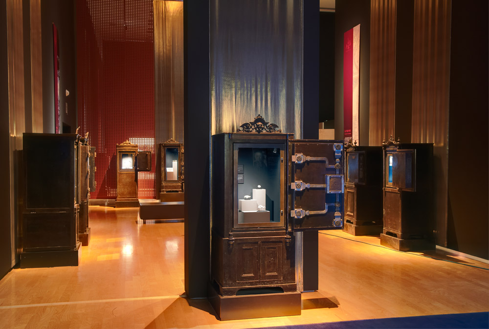 La conception tient compte d’une contrainte de taille : installer toute l’exposition en une dizaine jours seulement. Tous les éléments sont donc construits en atelier afin de réduire au maximum le temps de montage sur site. À chaque présentation, la scénographie repose sur un concept signature : des coffres-forts anciens aménagés en vitrines pour renforcer la préciosité des objets.