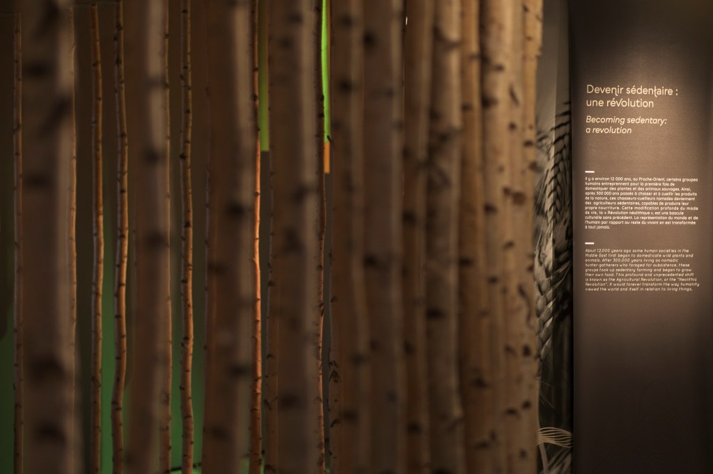 Dans l’exposition La Terre en héritage, une enceinte de troncs de bouleau marque la limite entre deux époques: le Néolithique et nos jours. Un même thème peut être développé de part et d’autre et les visiteurs peuvent ainsi mieux comprendre que ce qui nous sépare de nos ancêtres, ce sont surtout les moyens techniques. Les besoins restent identiques.